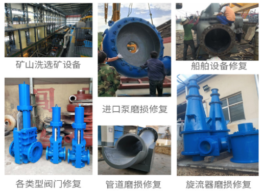 主要应用于:选矿设备过流冲蚀磨损修复,如:旋风分离器,浮选柱,浮选机,泡沫罐,分级机,搅拌罐等设备的预涂耐磨层,溜槽的维修,管道配件,渣浆泵和其他设备(典型用途请参见主要物理和机械性能表)。